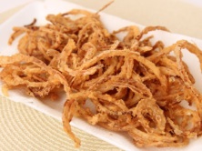 Also called onion strings, French fried onions are onions that are sliced very thin, soaked in something, like buttermilk and other ingredients, coated with a dry ingredient like flour, and fried to make them crispy and golden.